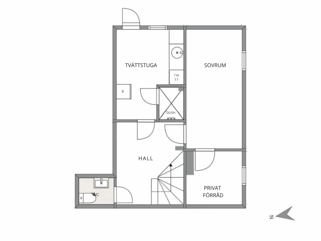 Souterrängvåning: Utrustad med tvättmaskin, torktumlare, strykbräda och strykjärn. Här finns även bergvärmepumpen.